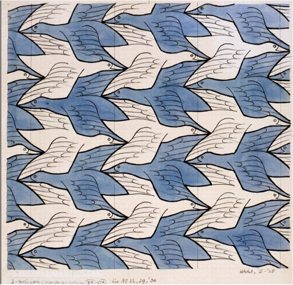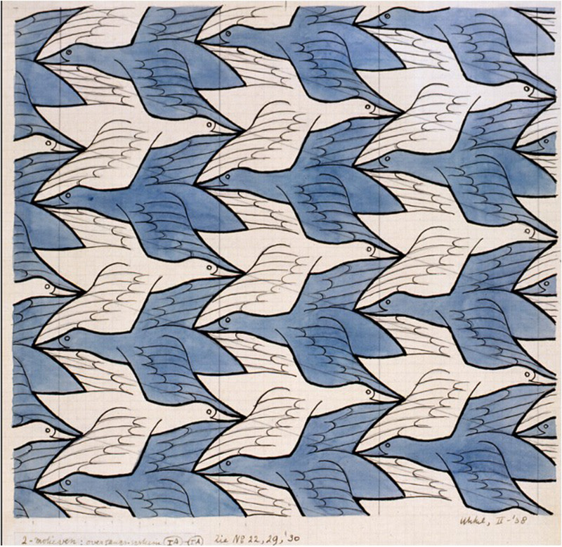 Van der Welle says the strong momentum of the AI theme resembles the white birds in M.C. Escher’s famous 1938 ‘Two birds’ lithograph, shown below. The white birds quickly catch the eye (and imagination), but upon closer inspection an identical bird with notably darker plumage symmetrically appears from the background, flying in the opposite direction.