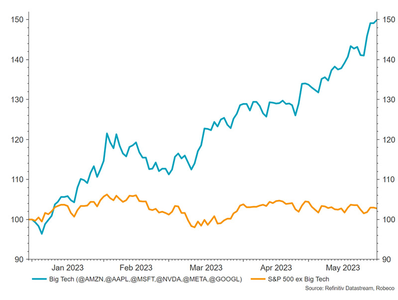 Equities are trading in a narrow range not seen since the 2000 tech bubble and the 2020 Covid crisis as the mega-tech stocks account for virtually all market returns. The artificial intelligence (AI) theme has particularly captured the imagination, sending ‘big tech’ share prices soaring.